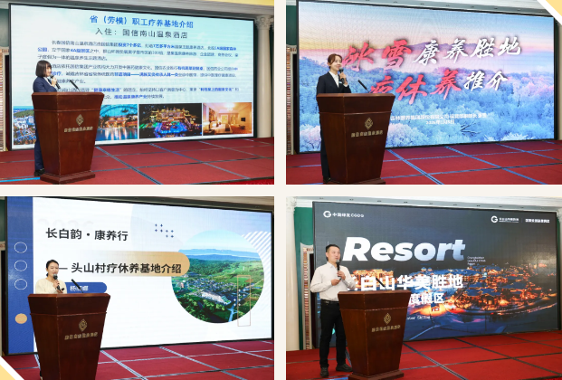 推介会上,长春国信南山酒店、安图铭睿-头山村、吉林颐养集团、长白山华美胜地四家吉林省职工(劳模)疗休养基地代表详细介绍了得天独厚的自然生态资源、丰富的康养业态以及特色职工疗休养产品,重点展示了涵盖生态观光、民俗体验、休闲康养等多元内容的疗休养线路。